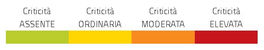 Nell'avviso di criticità, per ogni tipologia di rischio, sono riportati una sintetica valutazione degli effetti al suolo e l'indicazione dei livelli di criticità, per ogni zona omogenea, espressi attraverso il seguente codice colore con livelli di criticità crescente:
