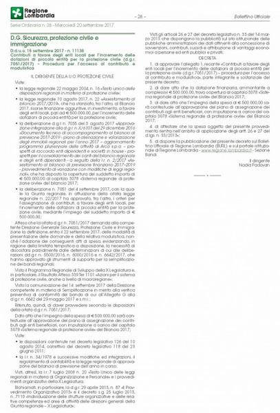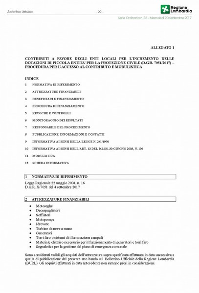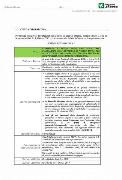 BANDO CONTRIBUTI, A FAVORE DEGLI ENTI LOCALI, PER L’INCREMENTO DELLE DOTAZIONI DI PICCOLA ENTITA’ PER LA PROTEZIONE CIVILE (L.R. 22/2017)